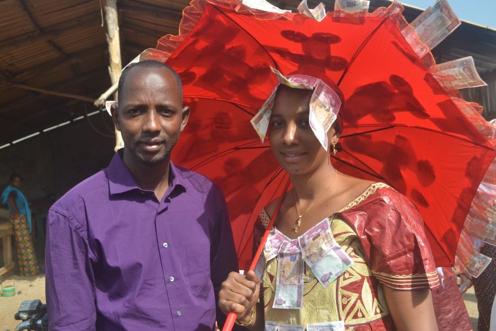 - La cérémonie traditionnelle : Le rite traditionnel du mariage chez les Peuls a fortement subi l’influence de la modernité et s’est enrichi d’autres cultures. Il n’est pas homogène et peut différer d’un clan à un autre, voire d’une famille à une autre. On retrouve cependant quelques traits communs dans la couleur : « Diomba » (la mariée) est d’abord drapée dans une toile blanche non cousue qu’elle remplace ensuite par un joli complet de couleur rouge. Pour accentuer la beauté de ce complet, la modernité veut qu’il soit recouvert d’un tapis de billets de banque neufs, tout comme le parapluie, également rouge, que tient la mariée. Comptez entre 200.000 et 500.000 GNF pour cette opération esthétique. A ce niveau, je me permets de commettre un délit d’initié : mettez le montant le plus élevé et faites en sorte que le complet soit cousu le maximum de gros billets. Achetez une lame et attendez le lendemain de la cérémonie, où vous serez plus fauché qu’un rat d’église, pour vous attaquer sans scrupule au complet de Mme. Ça s’appelle du « donnant donnant ».