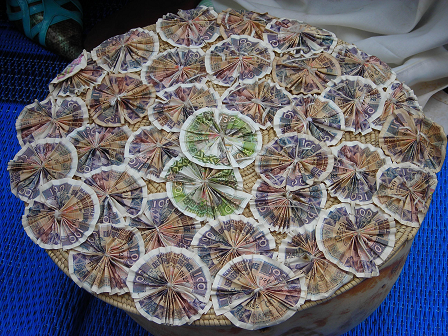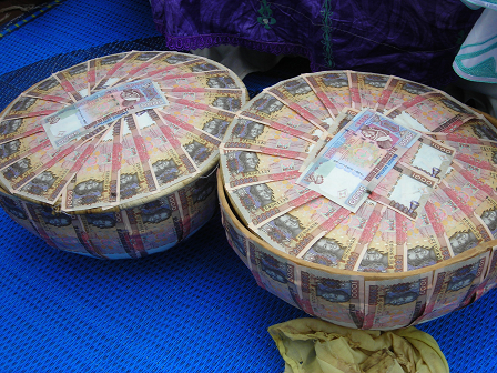 A l’occasion des mariages et de la traditionnelle cérémonie de réception des pèlerins, les femmes de chez nous, dans un art inimitable, décorent différents objets avec des billets de banque, sortis tout droit de l’usine. A l’approche de la cérémonie, ce sont des quantités importantes de vieux billets qui sont échangés dans les banques contre des neufs. Des spécialistes rompues à la matière se chargent du reste. A l’aide d’un fil et d’une aiguille, des calebasses, des vans, des colliers et des parapluies entiers sont transformés en objets d’art avec des coupures de 100 ; 500 ; 1000 ; 5000 et 10 000 GNF. Ces objets sont offerts cérémonieusement, selon les cas, soit aux mariés ou au pèlerin.