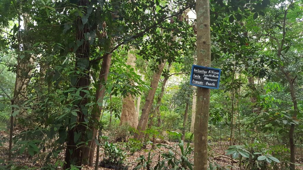 Flamboyant originaire de Madagascar, acacia mangium en provenance des forêts de l’Australie, ylang-ylang ou arbre à parfum des Iles Comores, hévéa du Brésil, tiama de l’Angola, cèdre, pimenta, terminalia catapa (fôté kansi), tek, cannelle, copalier … le jardin botanique compte actuellement plus d’une centaine d’espèces ornementales, fruitières et forestières. Au grand bonheur de petits animaux de type fourmis et oiseaux qui foisonnent.