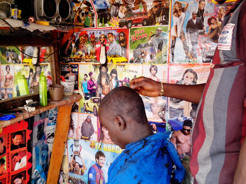 Disons qu’un salon de coiffure (homme) remplit, certes, sa fonction première : celle d’être un lieu où l’on peut vous refaire la beauté. Une gamme de mille et un modèles de coiffures des plus loufoques aux plus artistiques à votre disposition: ras congolais, Craig David, Singleton, Snoop Dog, Livio, zèbre, tête de mort, etc. Une lame et un simple peigne fin (Pour la tondeuse électrique, revenez quand le courant rebelle de Conakry décidera de pointer le nez). Avec ce matériel rustique, un gars s’attaque à votre tête qu’il tord, tond et sculpte en moins de vingt minutes. Pour une misère (moins de 0,5 euro) et dans des conditions d’hygiène souvent douteuses.